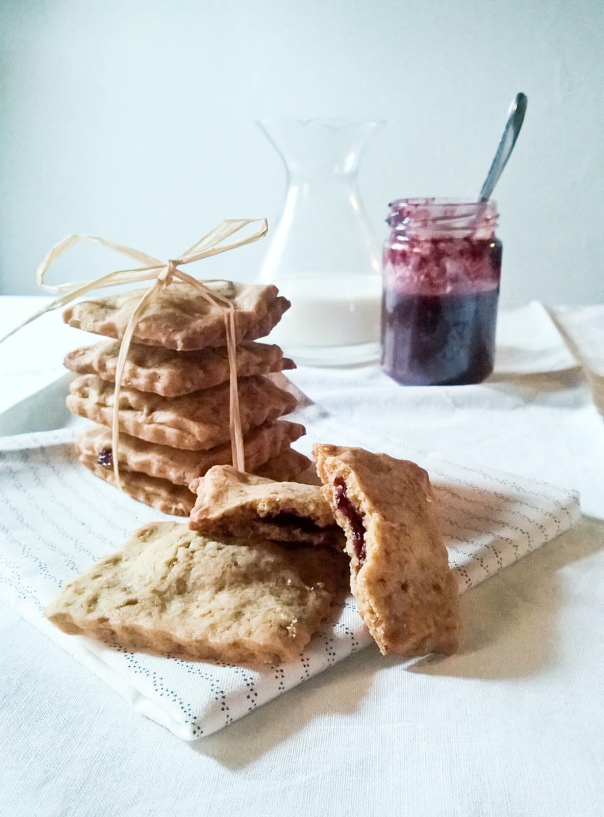 Il pomeriggio del primo gennaio ero in casa, con poca voglia di uscire, ancora mezza addormentata dopo aver tirato tardi a letto per compensare le ore piccole fatte la sera prima, e ho deciso di approfittarne per preparare dei biscotti delicati, con un ripieno fresco di marmellata, adatti ad iniziare l’anno in modo goloso ma non troppo pesante. Ho dato un’occhiata alla dispensa e il primo ingrediente che ho scelto è stata la farina di riso: profumata, fine, bianchissima.In frigo poi ho trovato la sua degna compagna: una marmellata di more che con il suo sapore intenso e il suo colore deciso ha reso questi biscottini degni della prima infornata del 2016!