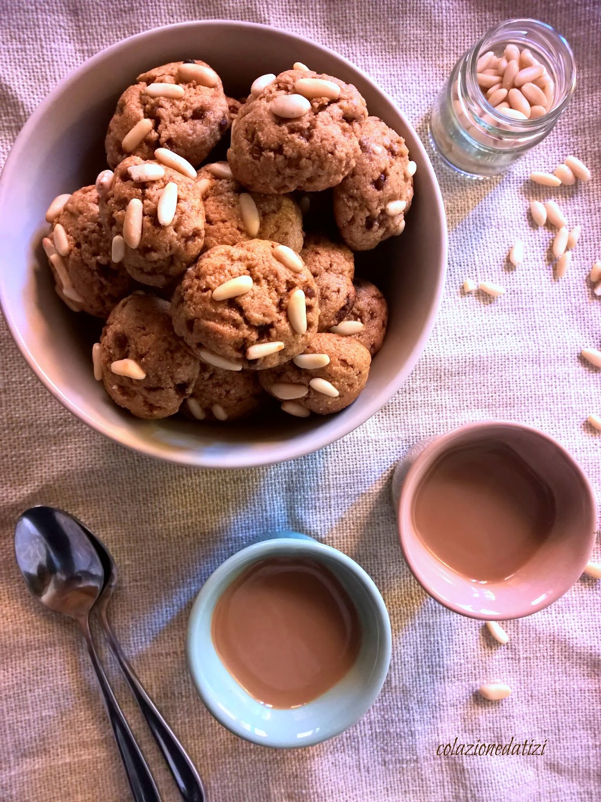 Riprendetelo, formate con le mani tante piccole palline e fatele rotolare nei pinoli in modo che tre o quattro di essi aderiscano al biscotto.